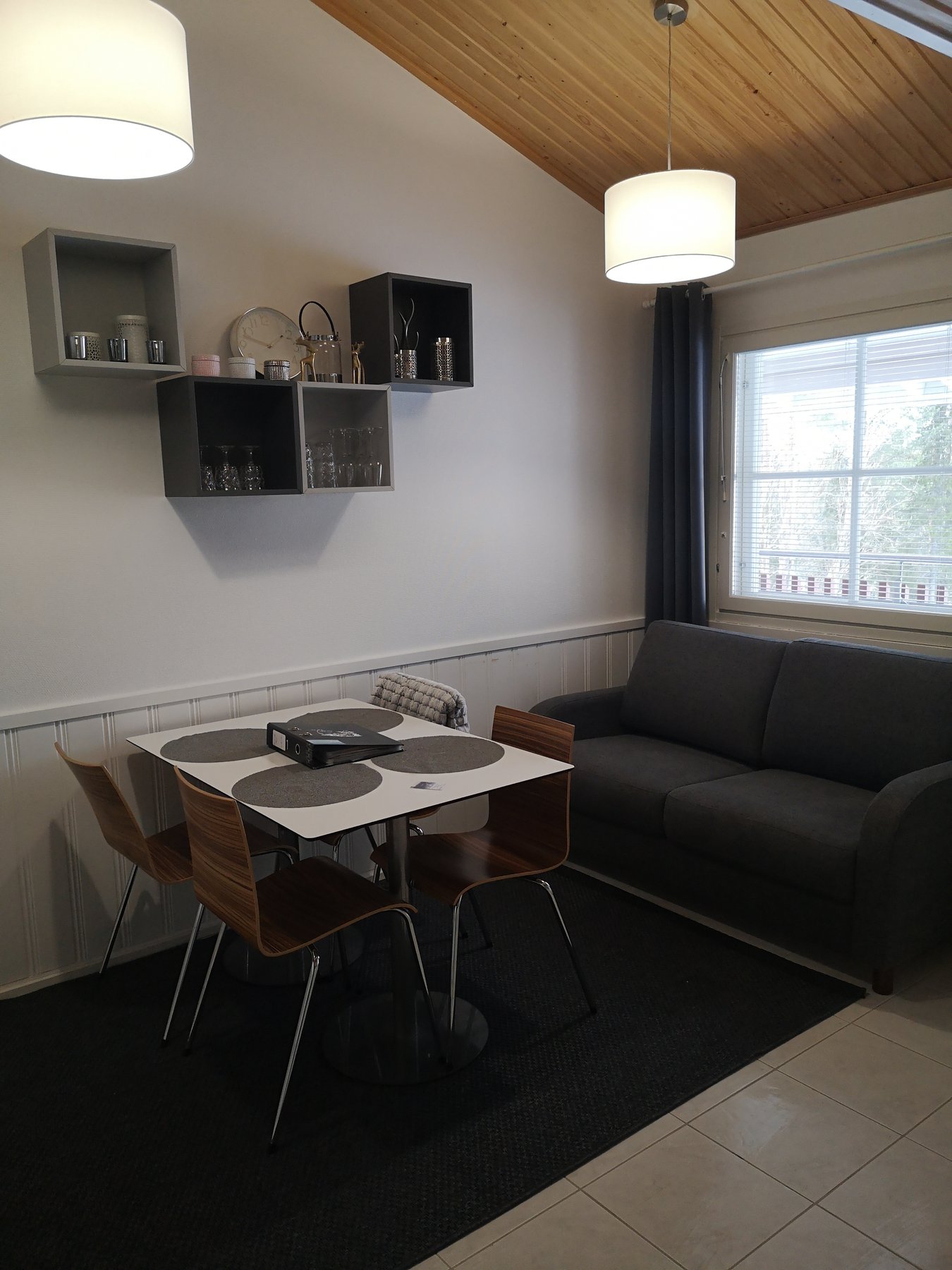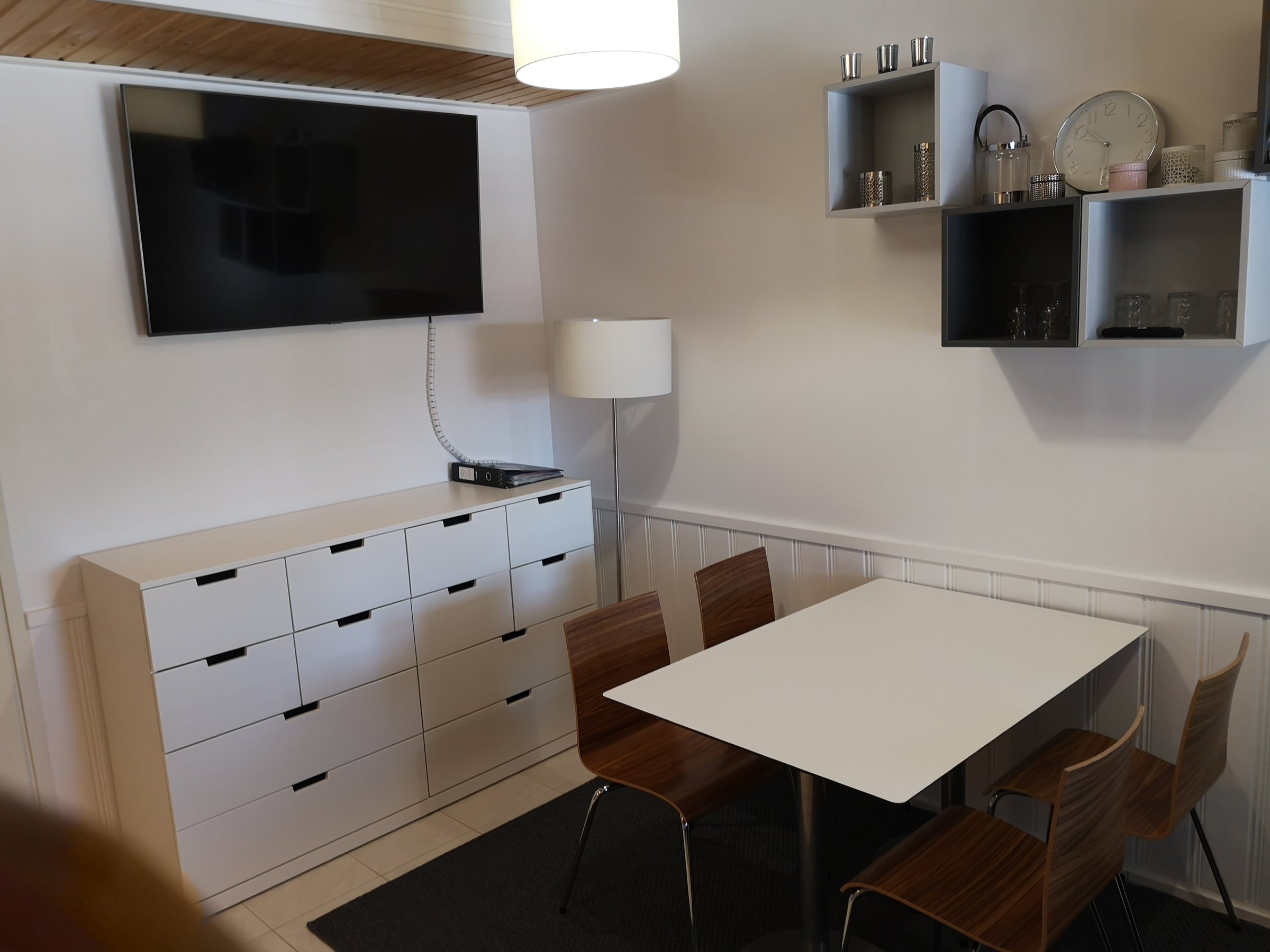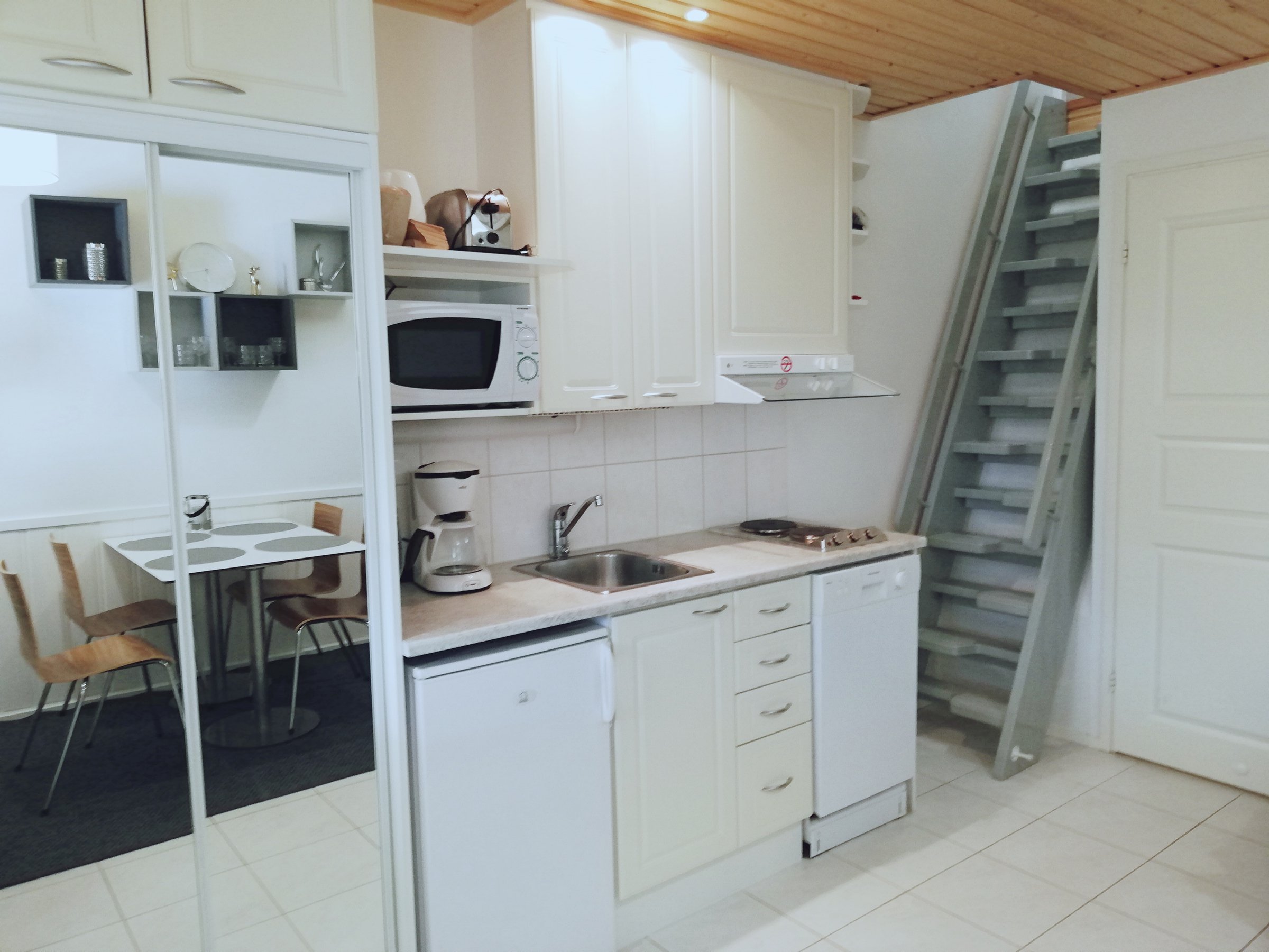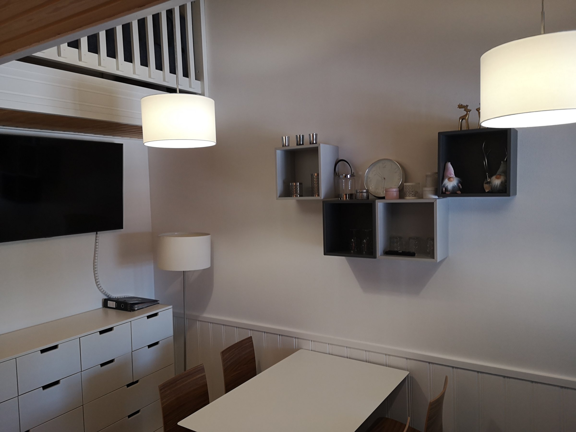 Huoneiston alakerta on toimiva yhdistelmä oleskelutilaa sekä tupakeittiötä. 4-hengen pöytäryhmä tarjoaa mahdollisuuden yhdessäololle tai ruokailulle ja levitettävä vuodesohva mahdollistaa rennomman oleskelun sekä esteettömän näkymän isolle taulutelevisiolle.